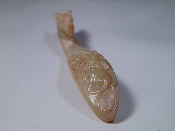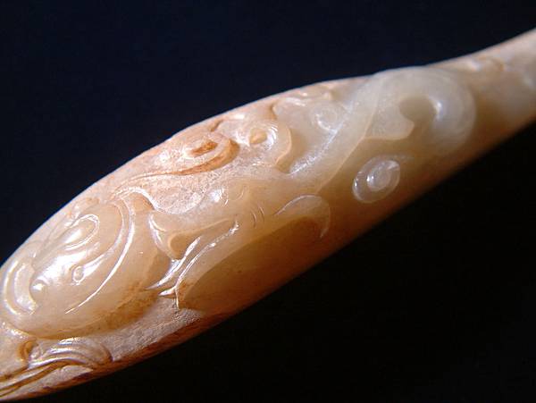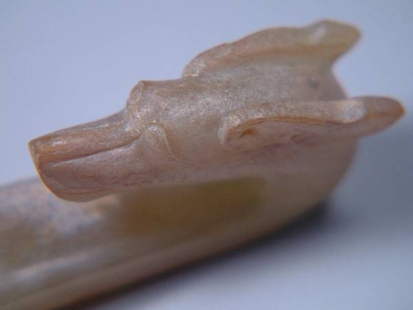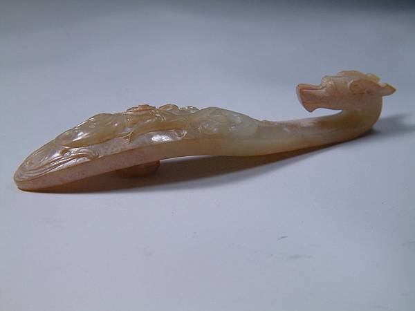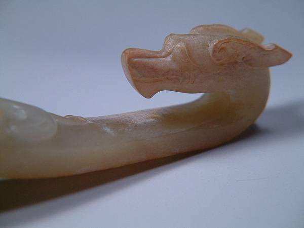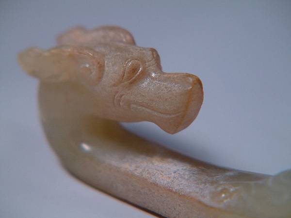 勾腹琢一龍,龍頭已從雲中鑽出向後張口吐舌,龍頸特長,身體前半部隱在雲中,鼻端左側為其後半身。龍尾居然採用難度較高的絞繩紋,東漢以後少見。一般龍首帶勾之勾腹雕琢的是螭紋,雕龍紋的不多見。