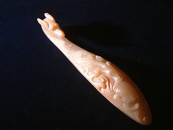 此器整體風格仍不脫漢朝神異靈動,但紋飾似較簡約、細長,較符合南北朝後期,甚至於隋唐的風格。現在出土時物已經可以確定,北周已經有玉帶銙出土,南北朝應該就是貴族的帶飾由玉帶勾轉為玉帶銙的過渡時期,之後的六、七百年,玉帶勾退出了中國高端服飾的市場,本件玉帶勾為高古玉帶勾的最後身影。