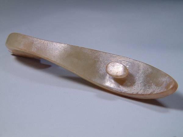 此橢圓紐為勾體寬度的三分之一,較戰漢一般與勾體同寬或略窄的玉帶勾不同,猜測可能是用在皮帶上,皮革較硬,也較不會變形,所以勾紐不能太大,否則很難穿插進較厚的皮帶。