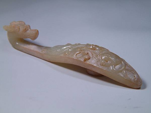 南北朝青玉龍首帶勾。和闐青玉質,部分器表受沁質變且略帶褐色。龍形勾首為戰國至南北朝慣用之紋飾,但本件玉帶勾較為狹窄,勾頭與勾頸卻比較長,似乎較為符合一般人的使用型態。勾腹琢一盤曲穿雲之龍紋,其形態與戰漢的龍形大異其趣,但做工尚稱精細,在後來隋唐玉帶銙興起前為玉帶勾留下最後的身影。