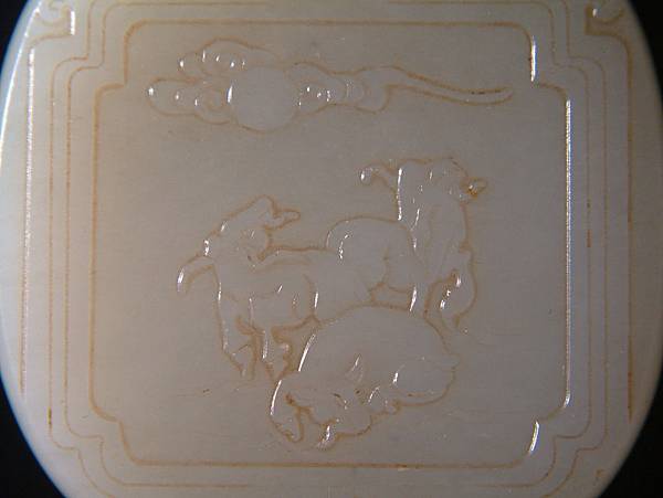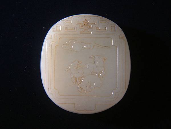 本玉牌採取重點紋飾拋光,其他部位霧面的手法,以凸顯主題,這種手法自在戰漢時期曾流行一陣子。前面的羊府臥似在吃草,中間的羊騰躍間回頭望月,最後一隻羊看著中間的羊,似在隨著牠奔跑。如意狀的雲頭伴著明月,代表著祥和、否極泰來。