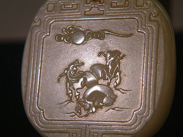 所以,別小看了玉師傅雕琢的這三隻羊,充分演示了「三陽開泰」的寓意。後兩隻羊向前奔騰,中間的羊還回頭望月,月亮為太陰,代表陰氣,陰氣已被羊甩在後面,兩隻羊奔向的自然是太陽了,前方的陽氣逐漸充沛,生養著萬物,伏臥的羊在不毛之地的細縫中吃草,表示冬去春來,青草已在冒頭了。這些不都充分說明「三陽開泰」的意境?