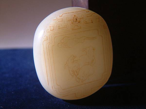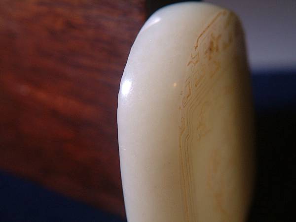 隱約可看到仔兒玉的燉蘿蔔紋。本件牌飾很厚,異於一般玉牌。