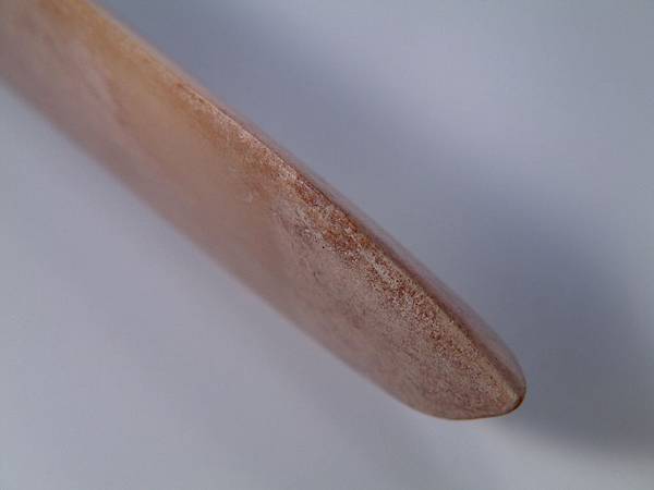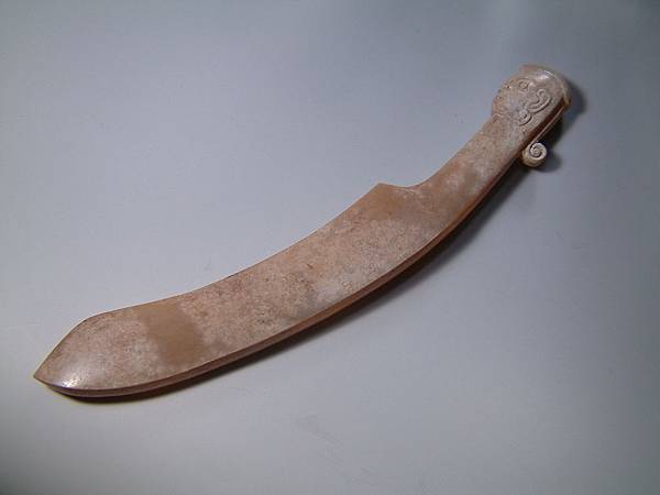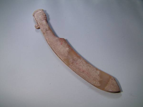 商代小型玉彎刀或十數公分之玉觿出土數不少,把手後端一般均有飾樣。此玉刀亦同,惟刀鋒不利,刀把過短,應非日常割切之用。故此器應為貴族餐具或為擁有軍事能力者之代表物。