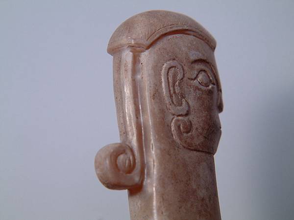 龍山文化、石家河文化出土之正面人像常見頂上平頭短髮,而本器則像其側面像,但頭後長髮垂至頸部,這髮型還真有現代龐克族的範啊!寬鼻、大耳。眼琢出前後眼角紋,西周早期至漢為常見手法,但在商代卻是少見。嘴以粗陰線表示,讓觀者覺得其緊抿嘴巴。下巴延伸至耳下以上捲陽渦紋收勢。此人頭與1988年湖北省天門縣石家河肖家屋脊6號墓出土那璜形帶著尖冠的玉人頭飾(湖北省荊州市博物館藏)倒有幾分神似。