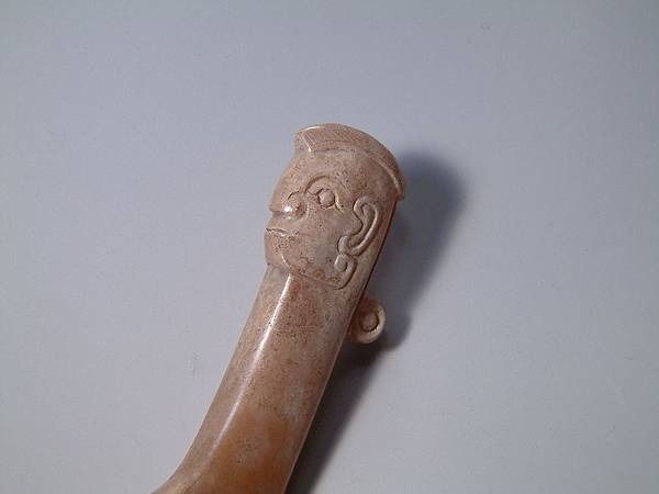 商代白玉人頭刀首玉刀。本器把手末端琢一男性人頭,長髮垂至頸部後捲,把手僅約長6.8公分,且捲起之髮稍抵住手心持握時甚不舒適,應非向下砍砸的實用器。但如果像塞外民族隨身小刀的用法,將刀刃向著自己,切撕烤熟的肉塊後用大拇指刀壓著,送入口中大啖,到是極為順手,且那向後凸捲的髮梢,會卡在手指間,增加握持的力道,即使滿手的牛油、羊油,亦不會滑手,因此可能是貴族的用餐餐具。刀背厚約1公分,向刀鋒斜收,刀鋒處厚約0.1公分。本器為白玉,全器大面積沁蝕白化,且略殘留朱砂,沁蝕似與朱砂有關。