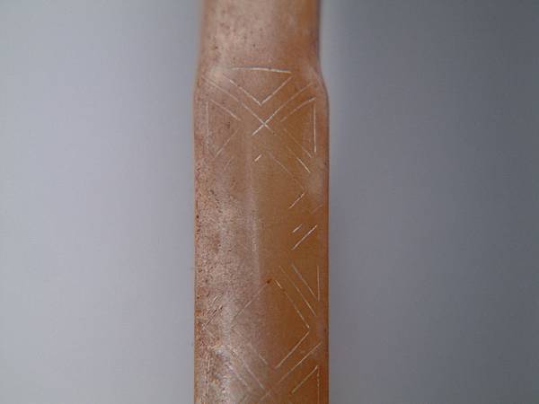 刀背圓弧,以砣具琢出細陰線,組合成四方及三角形紋飾。此紋飾與殷墟婦好墓出土的龍紋大玉刀(中國社會科學院考古研究所藏)中段的龍身紋飾相同。另商中、後期陰線幾何紋線條、相交、相接處之手法,與西周中期以後有明顯差異。商代陰線似只淺淺的碾琢一次,陰線有時會出現斷續、深淺粗細不一,且有時兩線未相接,少數砣碾又過頭,感覺較隋意,重形而不在意細節。西周中期以後玉器之陰線則似為反覆碾琢,陰線處理得較為深刻,粗細一致,相交、接處少有斷口或岐出之現象,細節處較商器明顯嚴謹用心。