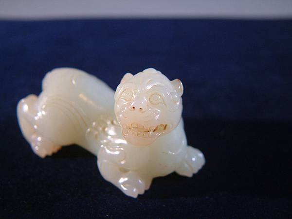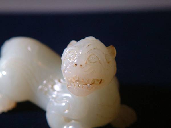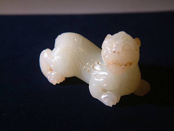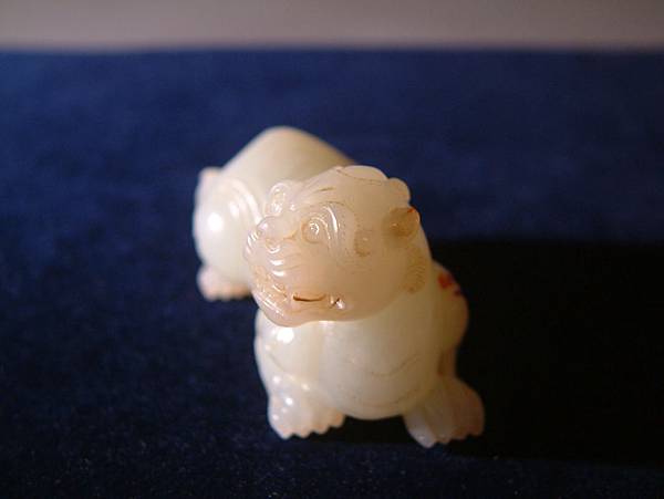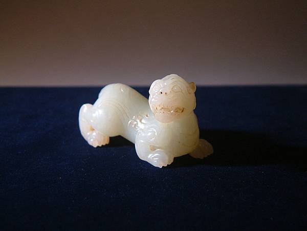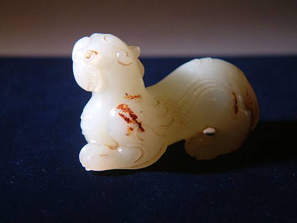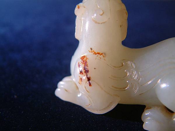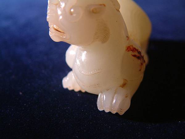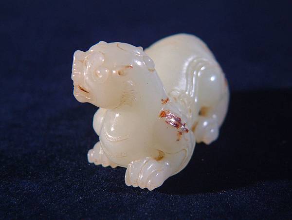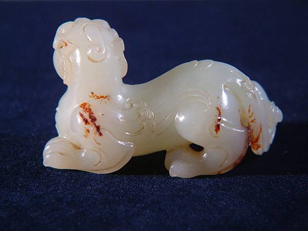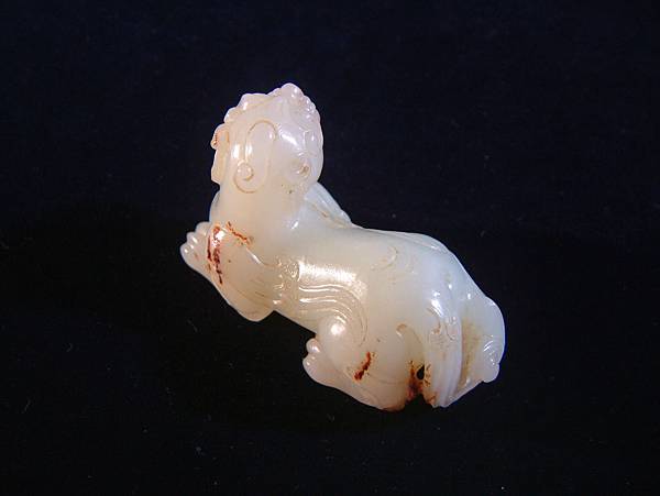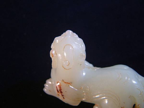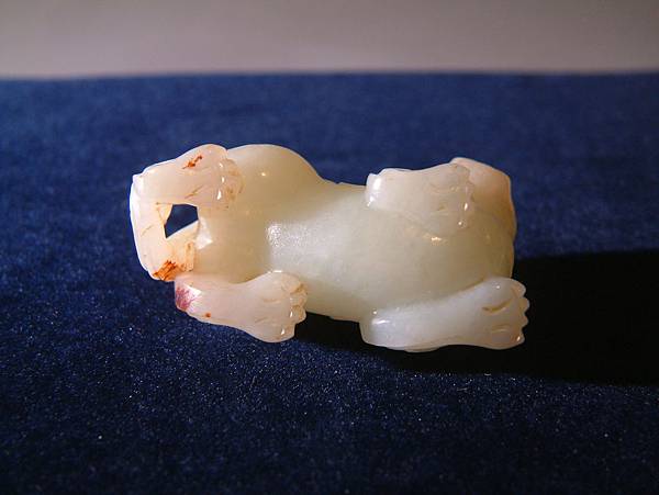 西漢青白仔兒玉天祿。和闐青白玉質,小部分器表紅沁。本件工藝精緻,作工頗細。天祿睜眼怒瞪,厚眉向後卷曲。齜牙張口,似在咆嘯。吻部略短,鼻頭圓凸。後掠耳。頭頂生有一角。琢有外張的腮毛,此為戰國龍、螭的玉雕手法遺存。兩肩部胸側,前面琢出三層向上卷的羽翅紋,後再琢出向後延伸的長羽翅紋。前低後高,四肢呈匍匐前進狀。尾琢絞繩紋向右卷曲,且根部琢有兩撇向左的毛紋。爪下用陰線琢出掌墊紋。本器應是西漢前、中期王室貴冑經常盤摩的