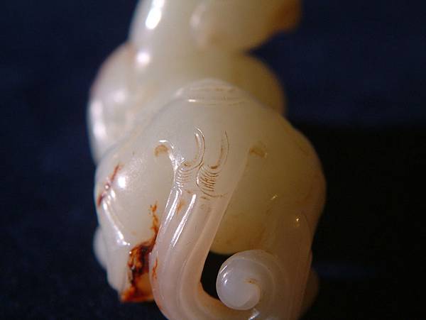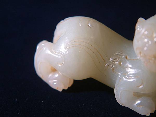 西漢前、中期的避邪、天祿,其尾巴根部時常琢有一撇或兩撇的逆毛紋,其他朝代似不見此手法,可作為時代風格的參考。