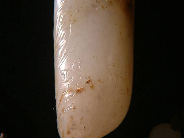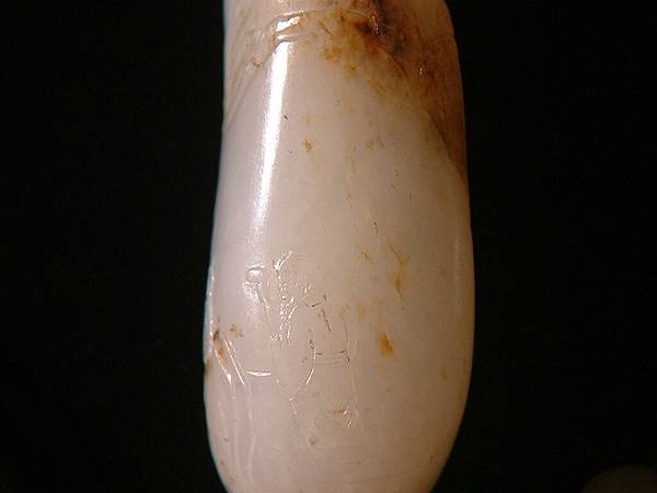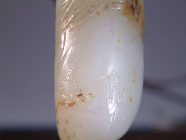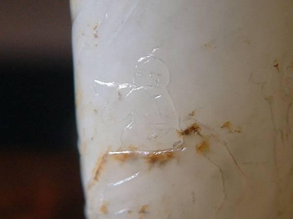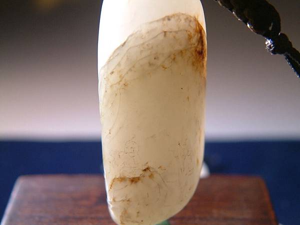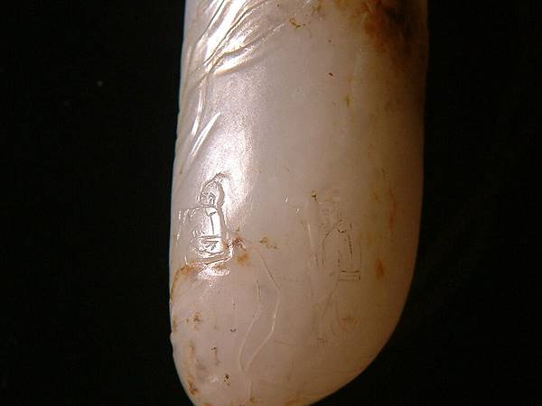 清代白玉尋隱者不遇詩意珮。和闐仔兒玉,間有雜質,略留皮色,珮體呈不規則長方體。本件採「薄意」工法,運用玉理間的雜質和留下來的皮色,巧雕為雲霧、山巒、樹影、苔點,平添了中國山水畫的意境。本珮約略可分為四面,除了四面均有遠山近石環繞之外,分別有松、老人、童子等詩內提到的主題紋飾。紋飾加上巧雕的色點陪襯,展現了唐代詩人賈島的「尋隱者不遇」意境。
