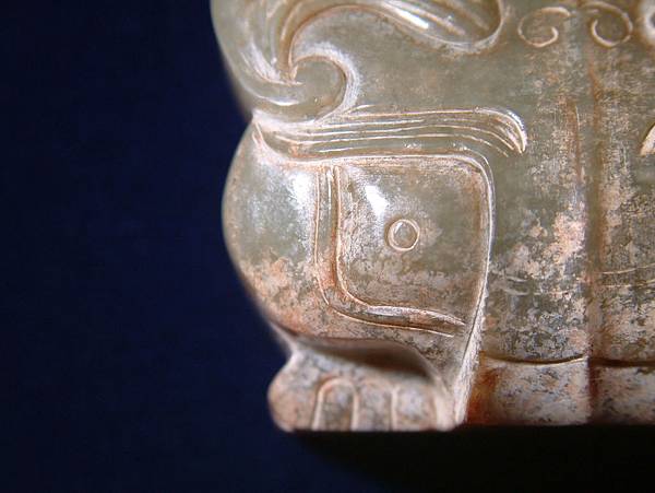 頭上的角使用絞絲紋,惟其工法與戰國末期、西漢的絞絲紋有頗大差異。本件絞絲紋是先以陰線標出凹槽方向與位置,再直接以砣具往復切磨將溝槽拓寬拓深,如此做出來的溝槽其弧度與深度是不一致的,不如西漢絞絲紋來得有銳利,也不如漢代的絞絲紋來得美觀,可卻有種蒼莽樸拙的感覺。