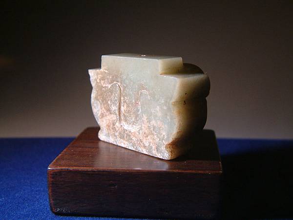 戰漢青玉饕餮紋珮,菱形眼,以砣具於雙眼上琢出數條長陰線表示眉紋,額頭正中央琢一仙花紋,仙花紋兩側長絞絲紋角,鼻樑向下延伸成為吻部,吻兩側再以陰線表示爪紋。頂至底有一天地穿,可供繫配,看風格可能為兵器上之垂吊飾,現在wake把它作為紙鎮。