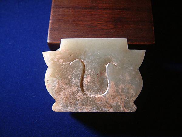 本件反映玻璃光,可能是入土時包覆著絲綢,膠原蛋白經過二千多年的分解,再附著在玉面上所致。