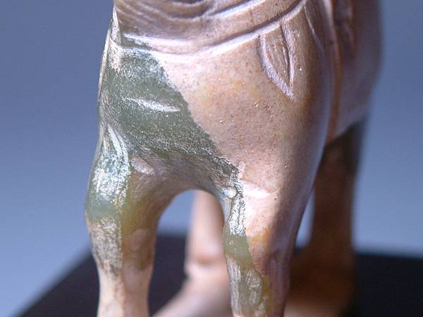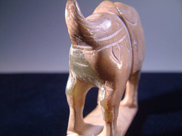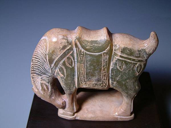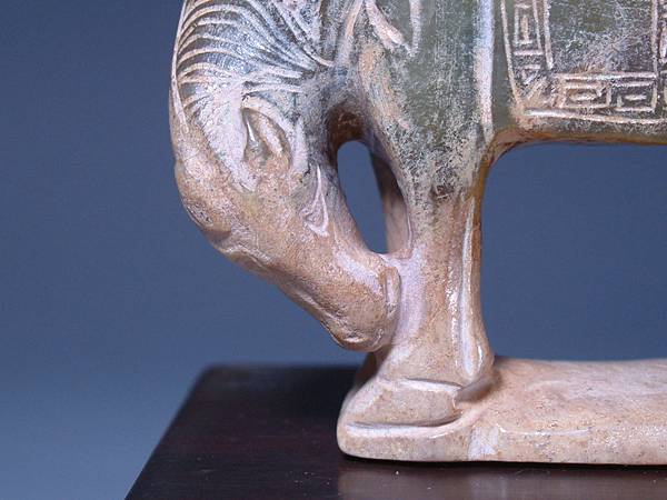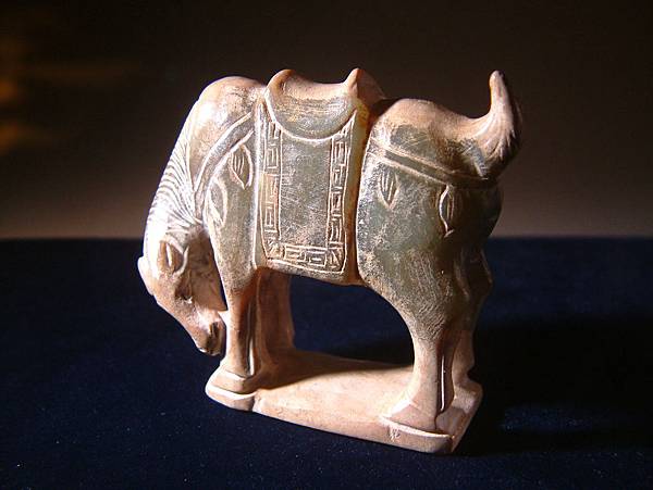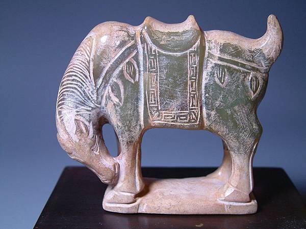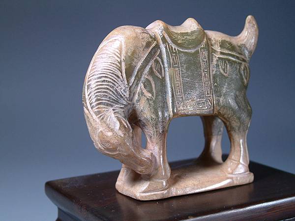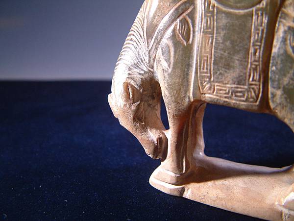 漢代青黃玉立馬。地方玉種,可能為南陽獨山玉的綠玉種,全器大部份已質變白化,流蘇、扎尾為漢、唐戰馬常有之形態。惟此馬雕工粗獷,卻又頗能展現戍守邊塞的蒼涼之感。作者似乎是雕刻戰馬已吃飽糧秣,在出戰前小憩,用牙啃咬左前腳的樣子,仍是漢朝抓住瞬間動感的手法。