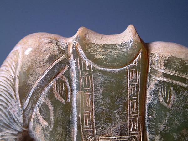 本件玉器玉質為地方玉種,雕工亦粗放不羈,但經過時光的再造,這匹戰馬卻出現了戍守邊疆的蒼茫淒涼之感,時間真是高明的藝術大師。