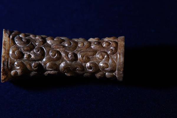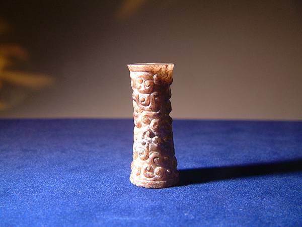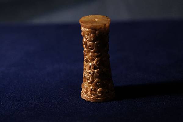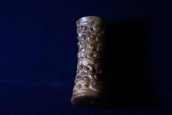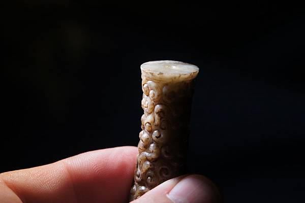 這種高浮雕的紋飾,當然比較費工,原主一定是寶愛有加,為日常隨身的配飾。同時代亦有出土一些略長、紋飾較平緩的「長勒子」,因出土位置在墓主的手部,故被大陸考古專家定名為「手握」(如下圖),大家就知道是啥意思了。不過,wake仍然對此定名有些懷疑,因為勒子一般也是配在腰帶下方,與手下垂的位置頗為相近,是否因而誤判用途?也不可知。Wake認為,是否為生前配戴的玉珮飾,還是身後專門用來陪葬的葬器,應該可以從是否有穿孔?有繫洞?來做判斷。因為,像此勒子要穿個天地穿,可也是耗時費工的活兒,在當時如果沒有要穿繩配戴,我相信是沒有人願意多此一舉的。可若是原主生前特別寶愛這些勒子,非得手握這些愛玉才肯下葬,那當然是用途改變,是另一回事兒了。