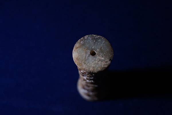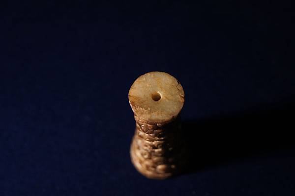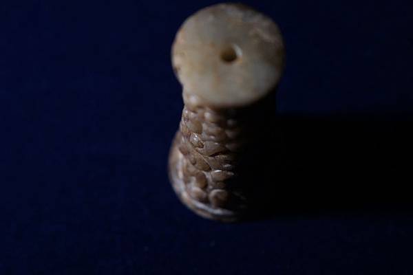 春秋白玉解體虺龍紋勒子。和闐白玉質,器表受金屬沁部分呈褐色,上下平面及紋飾浮凸處光澤鑑人,反映玻璃光。勒子器壁滿飾浮凸、勾卷的變形解構龍紋,為春秋向戰國時代此變動期,整組龍紋開始抽象化解構成桓雲紋、三角雲紋、穀紋等紋飾。本器有上下穿通的天地穿,為貴族外出的配飾。