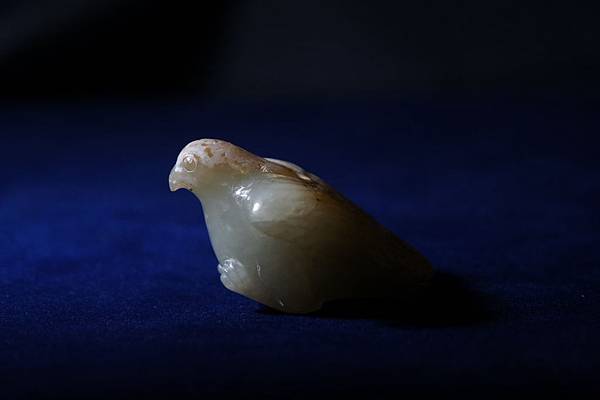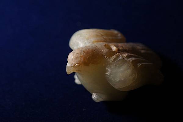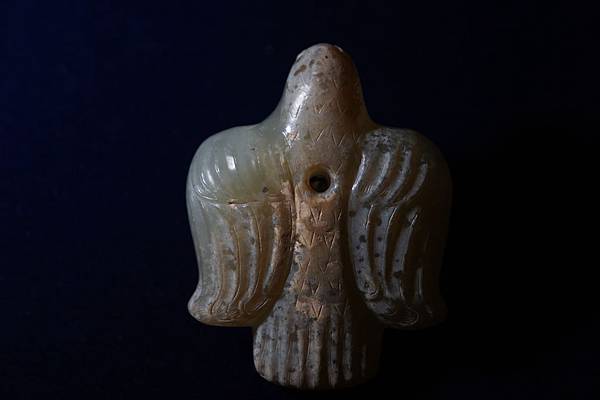 和闐青仔兒玉質,背面受沁成灰皮狀,玉質潤透,沉手。主要紋飾均在背面,短勾喙,管鑽眼,眼珠略為打磨成圓弧狀,頭頂、背部均琢出「倒人字」紋,代表短羽毛的羽尖,左右各琢有長五、短五支的翅羽紋,另在尾部琢出九支尾翼紋,腹部琢雙腳。背部與腹部雙腳間鑽了一繫孔,若繫繩配戴,則呈飛行的樣子。