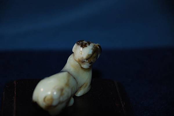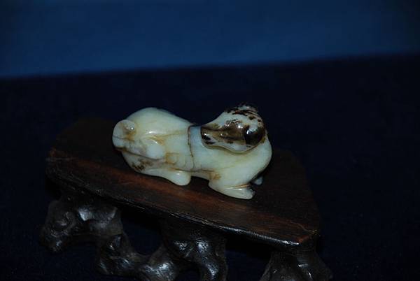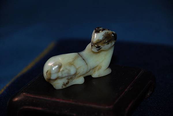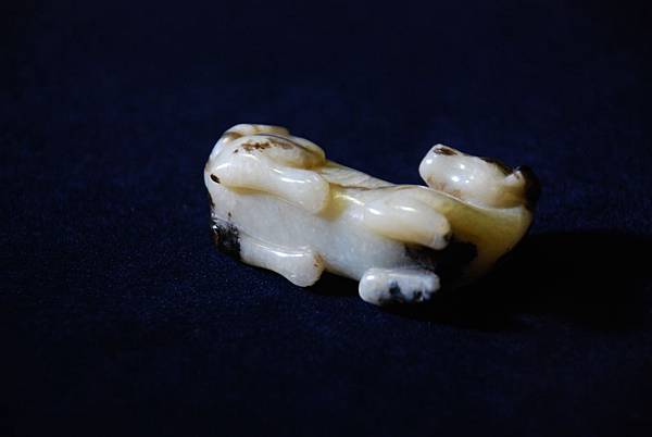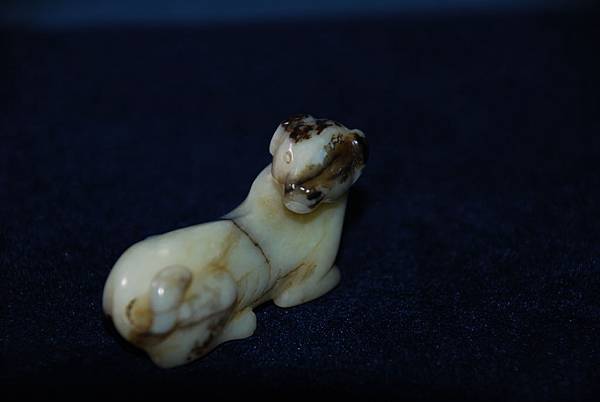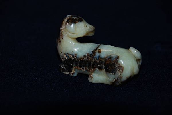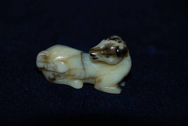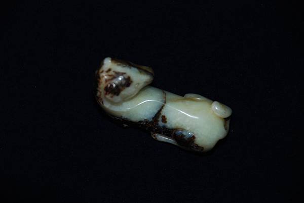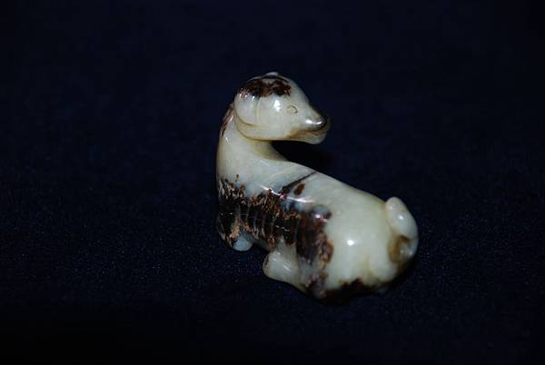 唐代白玉狗。和闐白玉質,原玉色近乎羊脂白玉,後受沁多處呈現黑褐色。以模真方式雕琢出狗形象,除陰線雕琢眼睛和肋骨之外,無其他額外紋飾。打磨精細,入手滑膩。惟前肢似嫌略短,判斷原應有交叉前肢,形成一交手孔洞以便系繩配戴,可能前主不慎而折斷,再加工修飾為今天的型態。