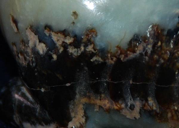 沁色與未受沁部分形成台階,下圖可見到金屬沁是沿著釁裂紋往玉理深入,且上下擴散,這麼厲害的沁蝕,可能是水銀沁吧?