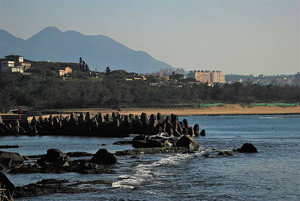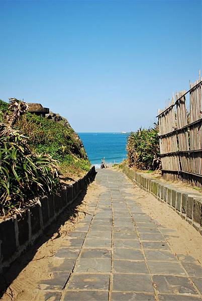 岬角左側的步道沙灘與麟山鼻漁港的防波堤。坡上那幾戶人家常常可以欣賞到台灣海峽的落日餘暉。