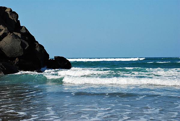 一路到底,看見一處廢棄的咖啡店,停好車,循小路下到海邊,右側是白沙灣,更遠的岬角是富貴角、富基漁港。
