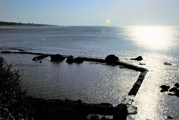 循著步道往麟山鼻漁港走,西方海邊有處人工石滬。這是當地人運用地形,用水泥築起的小小海堤,漲潮時海水帶著小魚進入了石滬裡,退潮後魚留在石滬裡,漁民就拿著網進石滬把逃不了的魚給撈了上來。這又是這塊土地先人配合大自然的變化,以智慧來克服困難的生活之道。