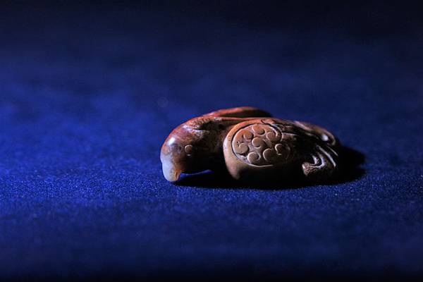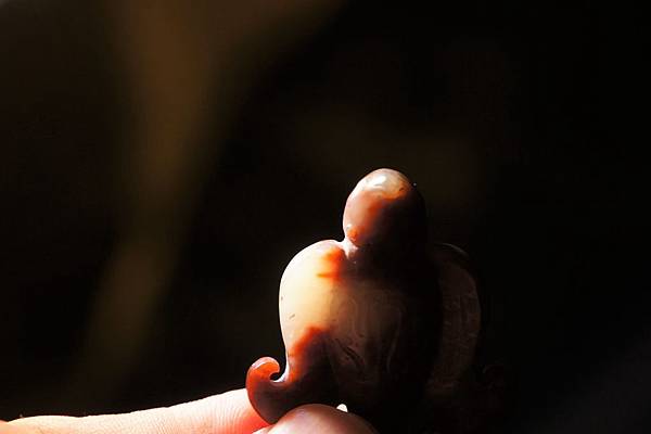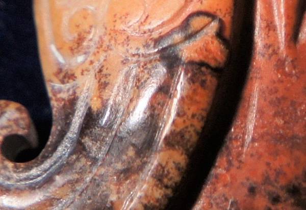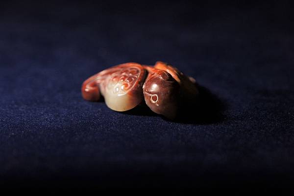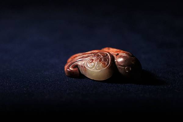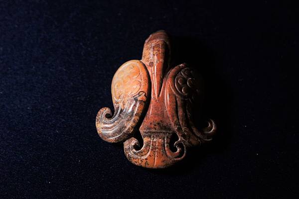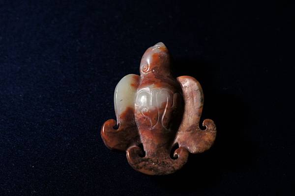本件玉鷹初看時以為是沁色,還紅、黃、赭、黑四種顏色,非常難得。可仔細一瞧,部分黑色細點比較像是石皮的雜色,且沒有台階,才斷為留皮雕。