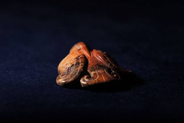 本件雖為白玉,但大部分為油潤的皮質,而黃、紅、赭色間雜黑色的皮色能讓本件玉鳥看起來更為生動,也算是留皮雕中的巧雕了。