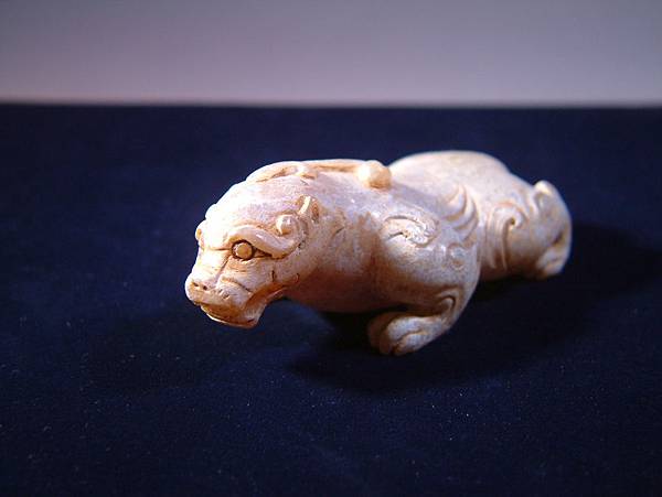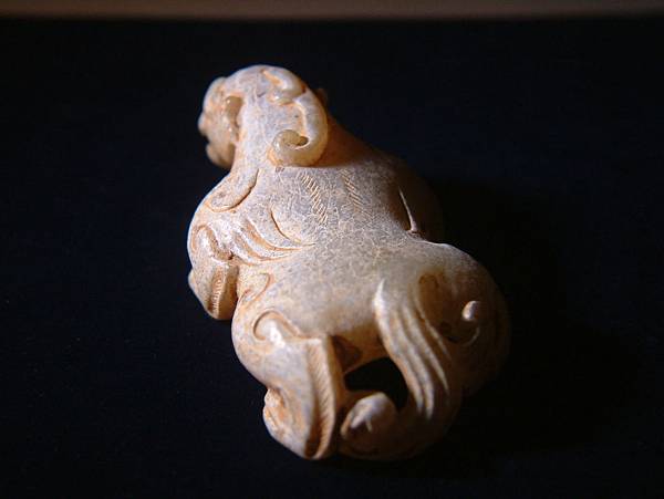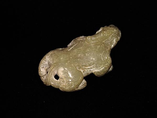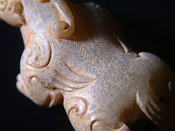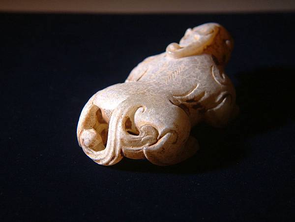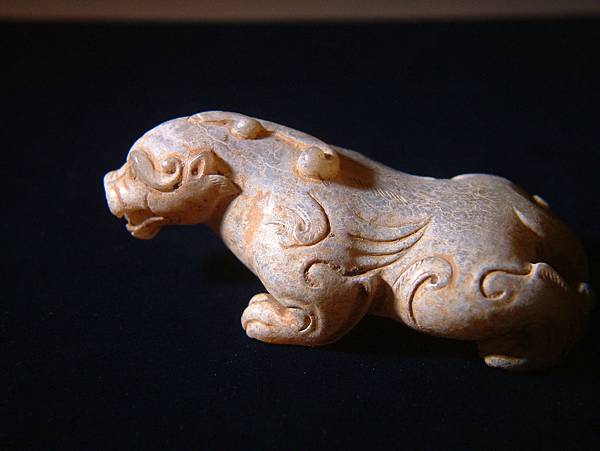 漢代青白玉寬體天祿。和闐青白玉,通體灰皮。管鑽眼,粗眉,張口露齒,似咆嘯狀。耳朵較小,與腮毛連成一塊。頭上的角分岔向後,末端卷曲。背上中脊線兩側琢短陰線毛紋,兩側肩上有兩撇外卷毛紋,背側琢出三層翅紋。四肢成匍匐前進狀,腿爪有力,大關節以卷窩紋表示,四肢後端琢短陰線毛紋。絞繩紋尾,上端有向右撇兩道毛紋。尾部與左後腳圈成一繫孔,應可隨身佩帶,既可盤玩,又可避邪。