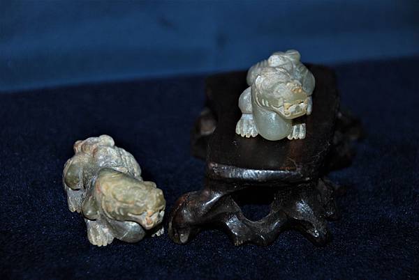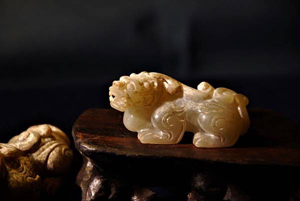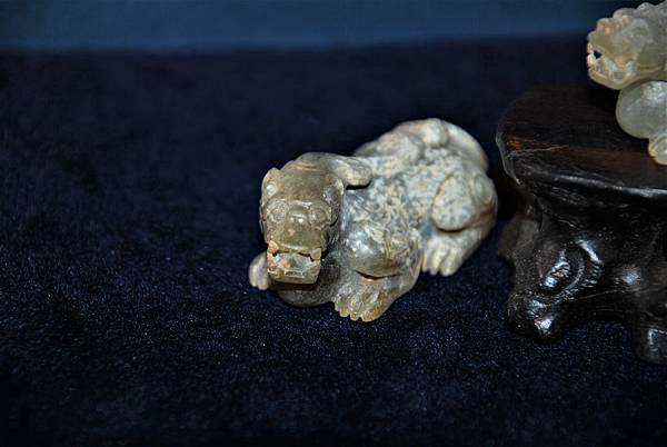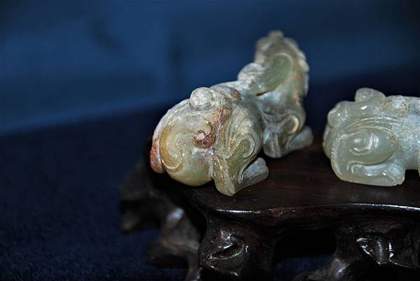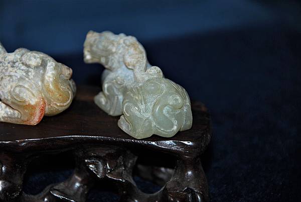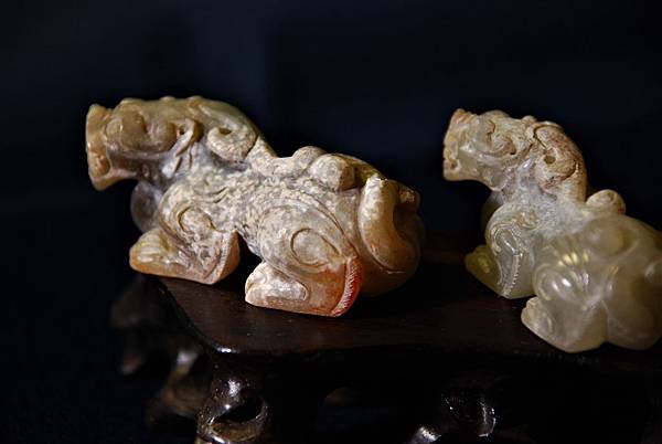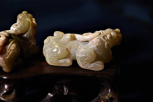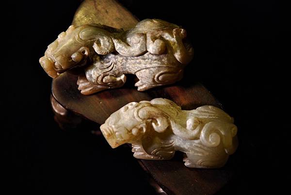 大隻的天祿背部白點反光與其他未質變的部位相同,故應該未傷及玉理。而點點狀的白沁最合理的形成可能就是入土時被灑上了硃砂,尤其是氧化汞的硃砂。其他尖角處的紅黃沁色應為同坑的鐵器氧化後受沁染。
