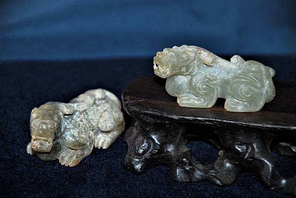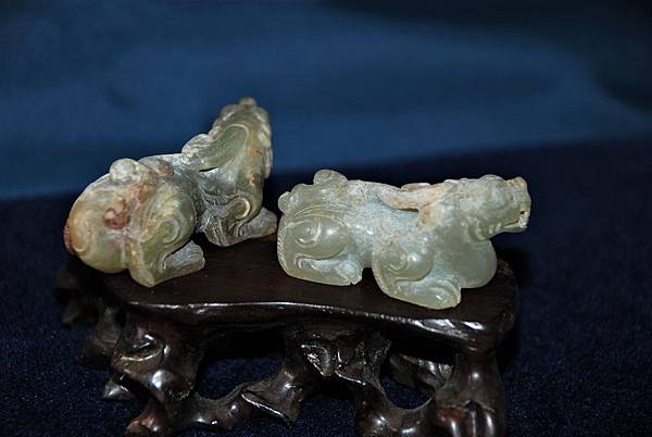 東漢青玉天祿一對。和闐清玉質,有部分背部器表受白沁,且呈點狀,推測可能為硃砂灑在背部所致,釁裂紋處或尖角受鐵沁呈黃紅色。兩隻天綠姿勢基本上一樣,呈趴臥狀,張嘴咆嘯,露獠牙,棗形圓眼,濃眉後撇,略扁的桶形耳,角分岔向後卷曲至背部。凸胸,肩上腹側琢有翅紋,卷窩紋代表大關節,分岔尾向前卷曲與頭上的角連接。本對天祿仍保持西漢部分元素,但做工打磨已經粗放,亦無西漢神獸的兇猛氣勢。頸後與角之間琢有一繫孔,可穿繩配戴作為厭勝避邪支配飾,亦可作案上擺飾或鎮宅、鎮墓神獸。