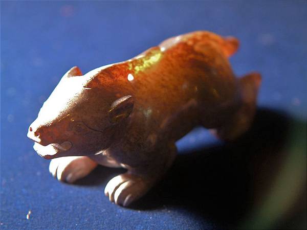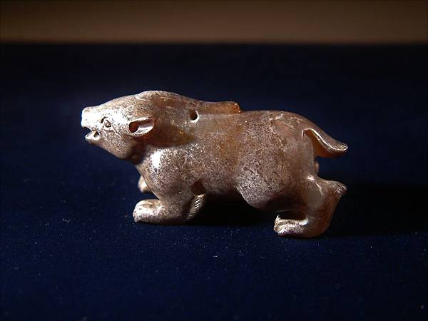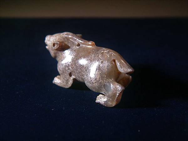 漢代白玉褐沁天祿。和闐白玉,玉質油潤,受褐色沁,前半部沁蝕較重,略有灰皮現象。本件天祿與其他神獸的形象不同,雖然頭上長有一支角,但身體卻像一隻過胖的雌山羌,但蹄部為爪掌,這神獸的型態沒見過,不知是否為現實世界的野獸?棗形眼,鼻端鑽有兩孔,張嘴咆嘯,後掠耳,頭上角延伸至背部。四肢粗壯,後緣琢細陰線細毛紋,四爪,短圓尾。角下琢有一小孔,可繫絲繩配戴,亦可作為擺設或鎮器。