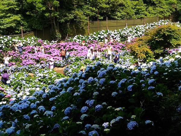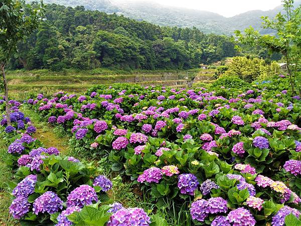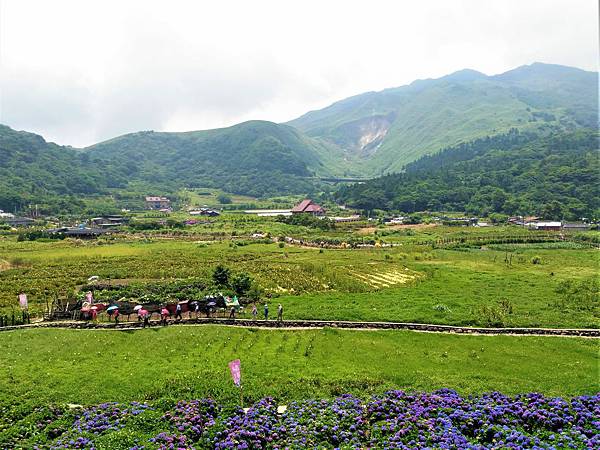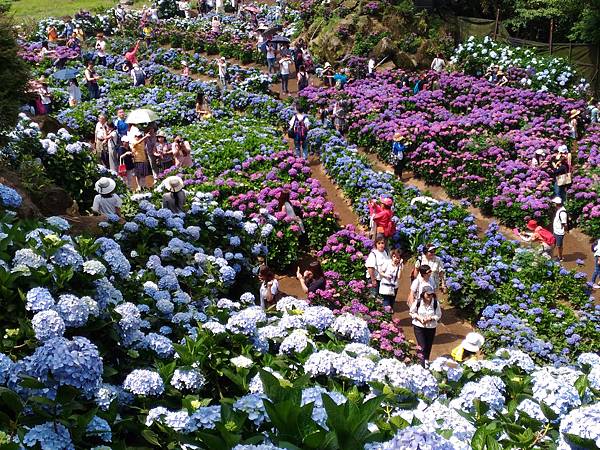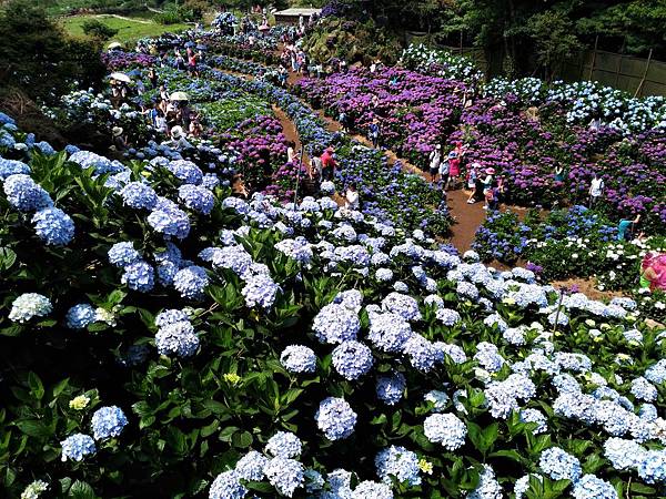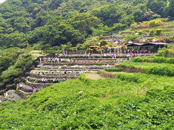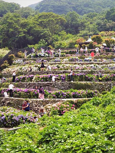 竹子湖另一欣賞繡球花的名所 [ 大梯田 ] ,也是人滿為患。原本想進去鐵棚下喝個茶的,遠看裡面早已坐滿了遊客,也就作罷。