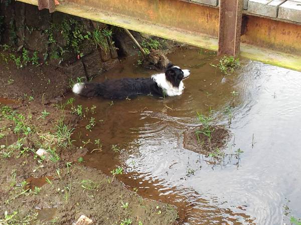在橋下納涼泡湯的聰明狗狗。