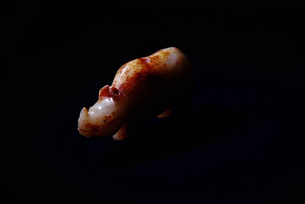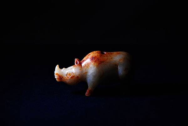 西周白仔兒玉犀牛珮。和闐白色仔兒玉,沉手,大部分器表受鐵沁,但仍維持比蠟狀光芒更光亮一些的反射光。犀牛呈立姿,圓凸眼,前後眼角均琢有一短陰線。鼻子上緣有長、短各一的角,嘴巴閉合,筒形耳,偶蹄,短尾左掃。全身無其他紋飾。背、腹間有穿孔,可繫繩配戴,孔內凹凸不平,鑽孔時一再錯位後再修正的明顯現象。為貴族隨身的珮飾或手把件。