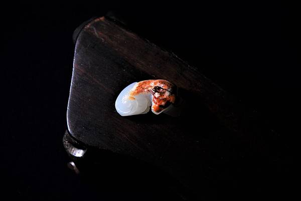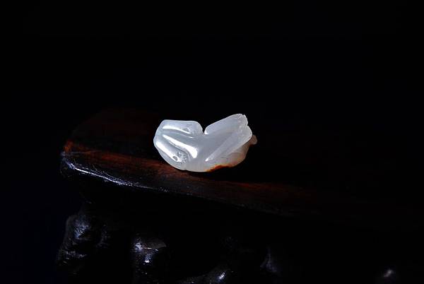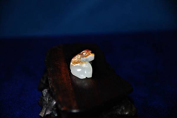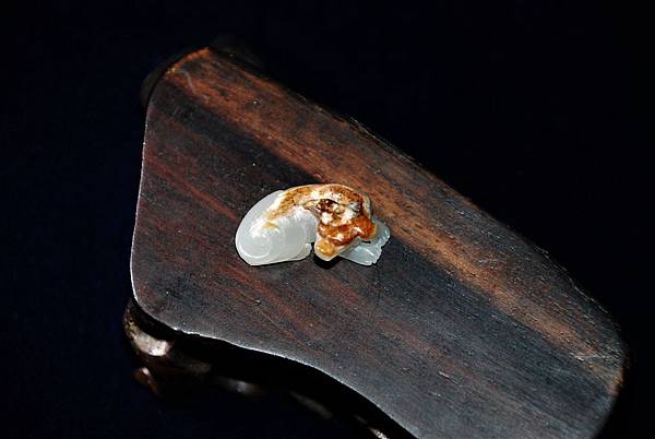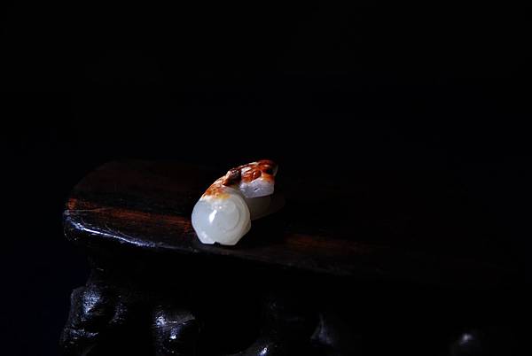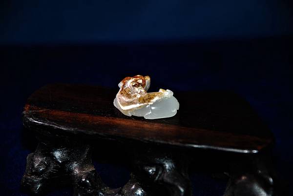 這麼小的玉件,很難在表面做文飾,倒不如保留一塊皮色,配合動物體型,做成巧雕,能為玉件增色不少。