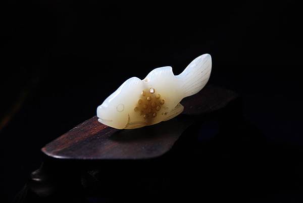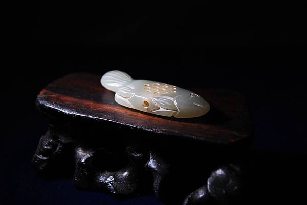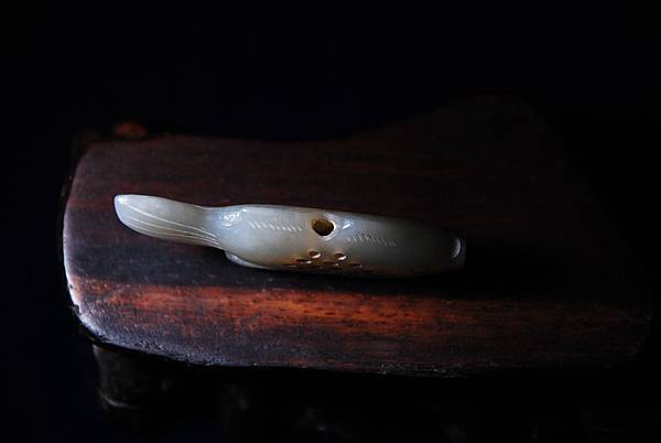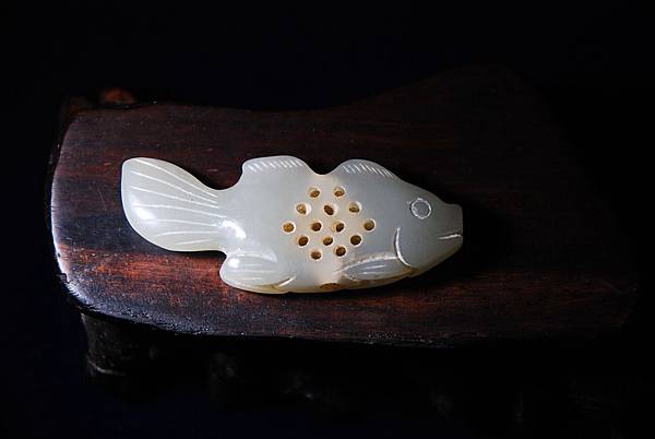 明清青白玉魚形香囊。和闐青白玉,玉質油潤。先片出魚形薄胚,再分別雕琢出嘴、眼、鰭、尾。背脊與魚肚中間,分別穿孔,再在魚身側面打出14個小孔,以便通氣透香,上下孔洞再運用類似鼻煙壺掏堂的手法,將魚身中間掏出一個約是1*1*0.4公分的空間,以容納香物。本器雖用陰線琢出輔助紋飾,但整體打磨精緻,觸體感覺細膩,可能是貼身的香囊。