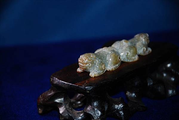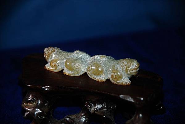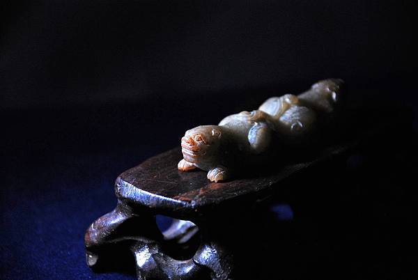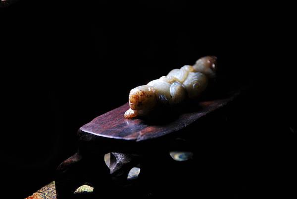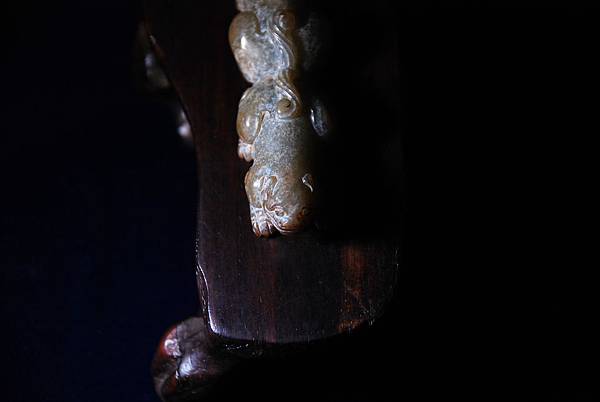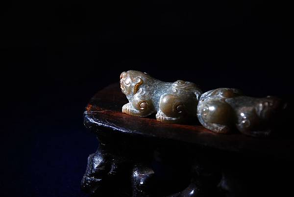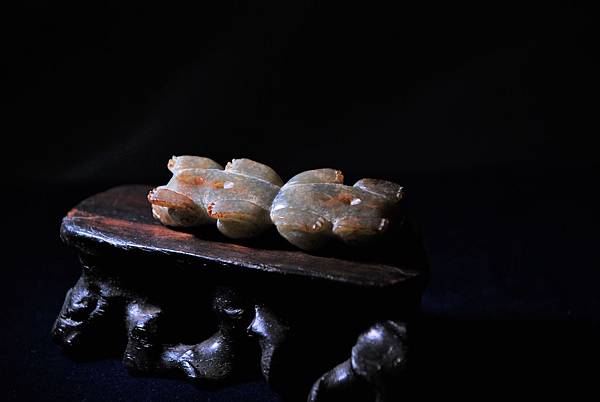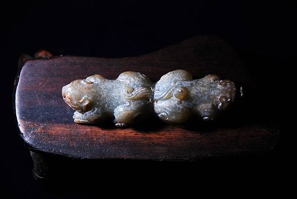 腹部的牛鼻穿告訴我們本器式鑲嵌在其他器物上的玉飾。用青玉為材質,以顏色搭配似乎表較可能是王公貴族甲冑上的配飾,尤其是在重要保護部位用重量較輕的青銅材質的話,此青玉的配飾還滿搭的。