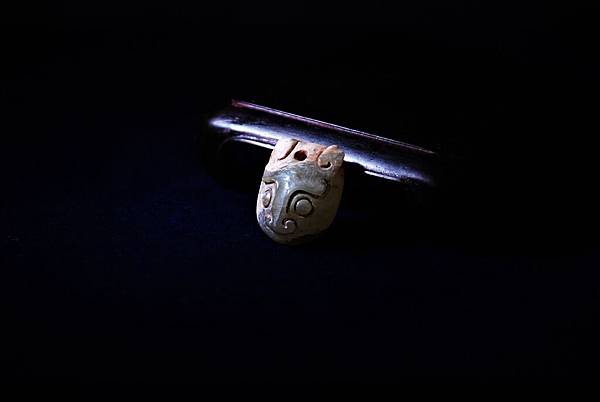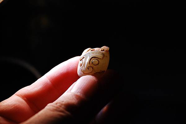 本圖放大可見到有些凹槽部位打磨並不是很精細,卻將當初的琢磨痕跡留了下來。這讓我們可以觀察到鼻樑上的那道略為圓弧的凹槽,邊緣還算整齊,戰漢時期常用在神獸尾巴的絞繩紋,似乎也是運用這樣的手法琢出凹槽的。那時,會不會已經有筒形的砣具?在不是平整的玉器表面,也可以較輕鬆的琢磨出精準的凹槽?