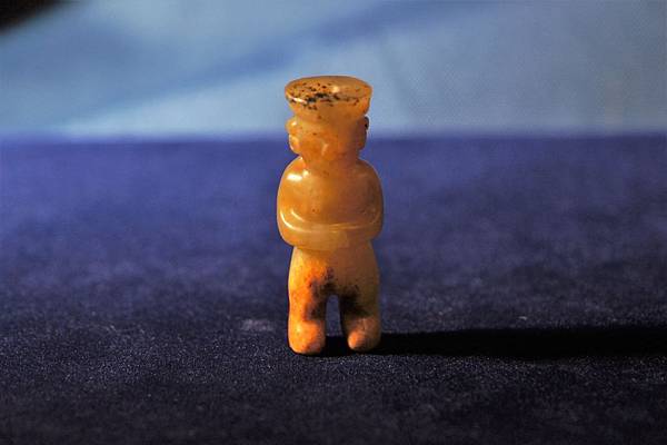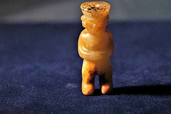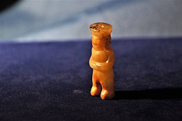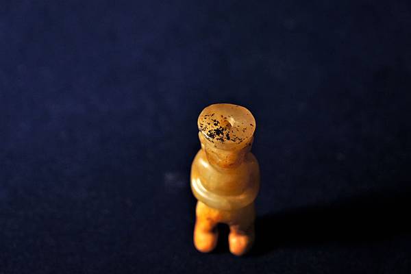 文化期青黃玉神祖立像。地方玉種,青黃玉,冠上有些許黑色黏附斑點,下身雙足受褐色沁。本件玉人頭上戴盤形冠帽,五官僅琢出大致輪廓,耳戴圓圈形耳飾,雙手環抱腹前,挺立前望,貌似在進行儀式。身體未雕琢紋飾,無法判斷是否著衣。下身較短,兩腿長度僅為身體的五分之一。全身打磨精細,光亮柔潤,或許為包漿。頸部左右對穿,又自頭頂鑽一繫孔與頸部左右對穿孔相通。