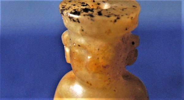 面容琢出大鼻頭,眉骨較突出,微凸的雙眼,但無切琢出眼睛的紋飾,細細的一條陰線代表緊閉的嘴巴。