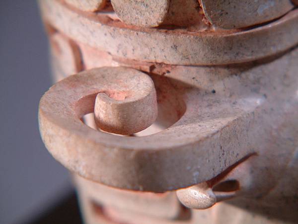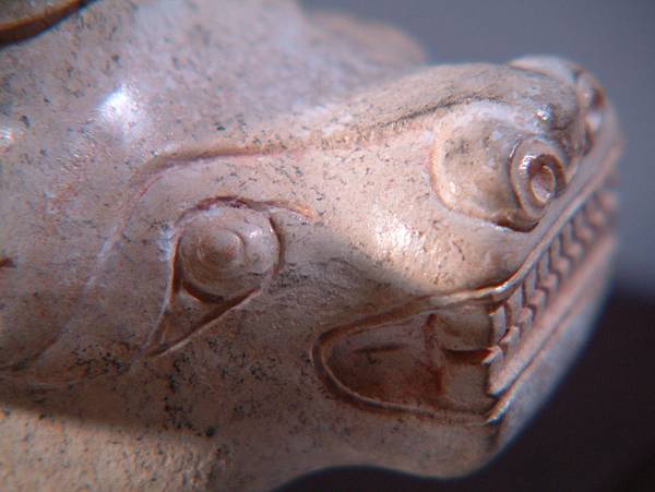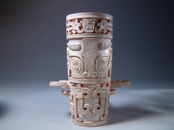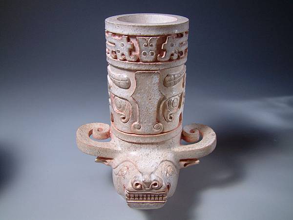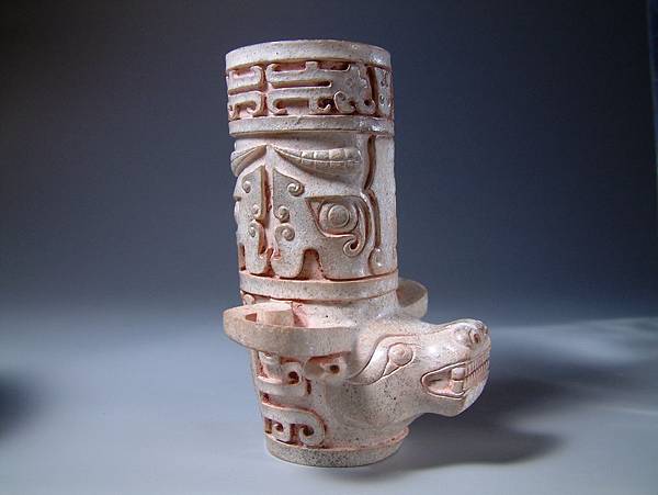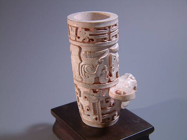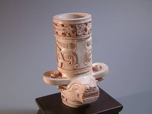 東周時,王立於郊山的祭壇之上,絲綢的罩衫在東風的吹拂下不停地擺動,祭司自「古父巳卣」中舀出香酒,倒入本器,王雙手持捧本器,恭敬地高舉過頭,祈求蒼天神明保佑國泰民安......。各位格友,有那麼點感覺木有?不過,格主還是斷本器為春秋戰國器,主因是目前出土玉器中,似乎未見商與西周有如此造型與用途之玉器,而戰國以後因玉器的發達,仿自青銅器的器物頗多,故依據白化、作工暫斷為東周玉器。