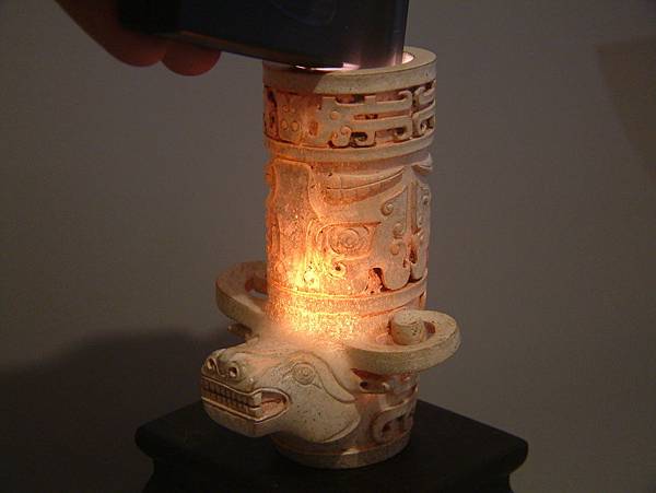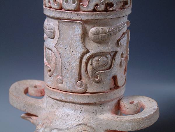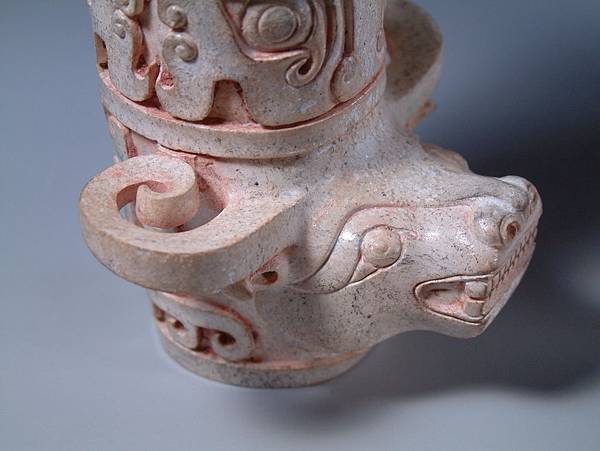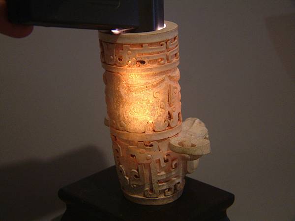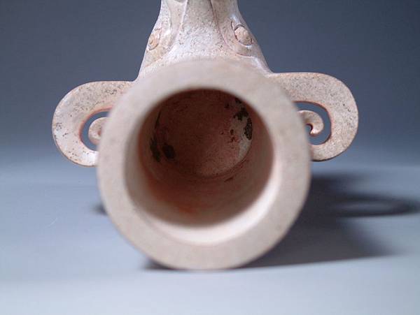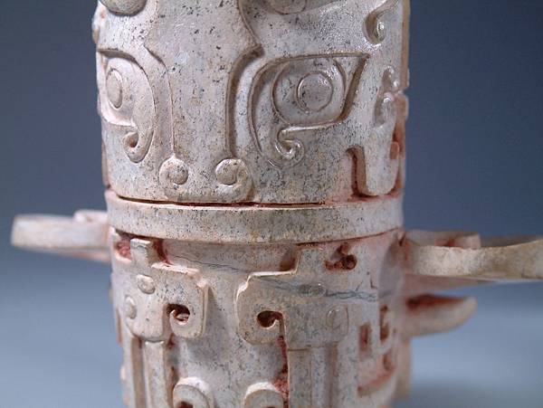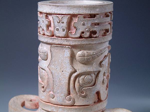 全器表面似乎麻麻髒髒的,其實那是器表未白化的原來玉質,仍可辨識出原為白玉。