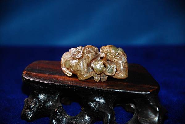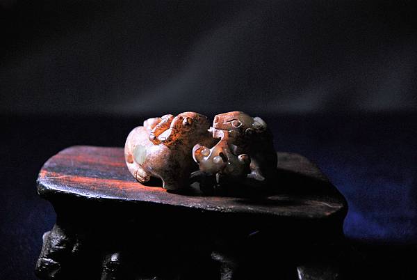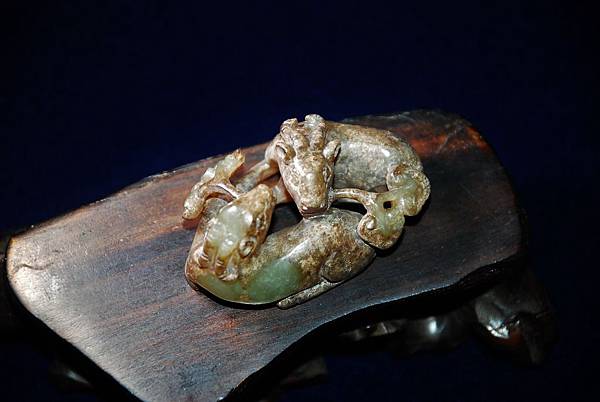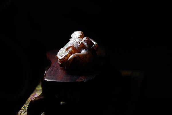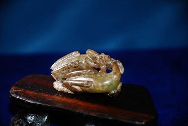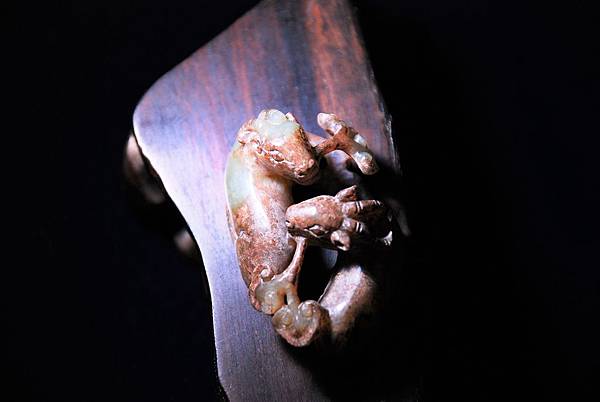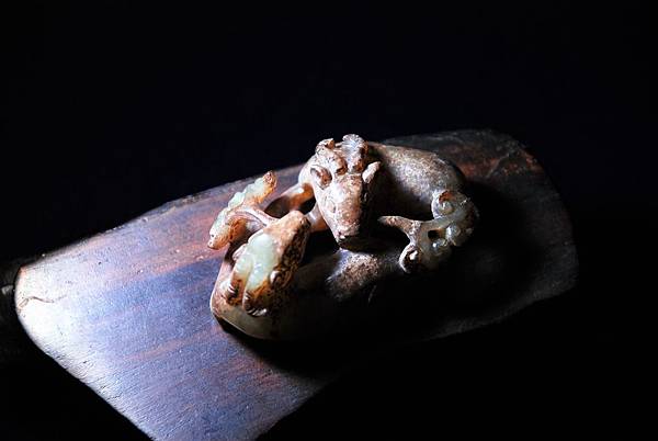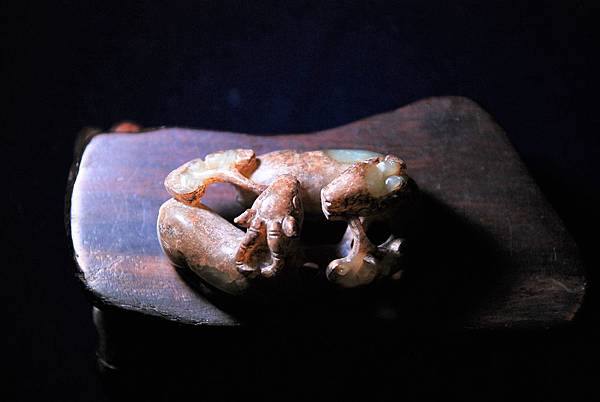 剛購藏時,表面較灰,稍事盤摩,受沁處即變得較為透明,顯然這受沁處已形成灰皮。但灰皮的形成似又非自然形成,而是由前主在擺設時沾染上的,這會是個甚麼情況?想了半天,只有一種解釋可說得通,就是這是一個道士在使用的筆擱。那為何會造成沁蝕?道士經常用朱砂畫符,硃砂含有重金屬成分,玉器經常沾染硃砂又未立即清洗,玉質又有些釁裂,就有可能形成本件似是流質物質慢慢倘留下來的沁蝕樣貌。
