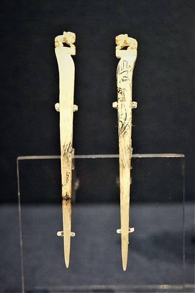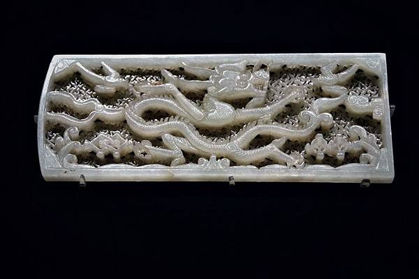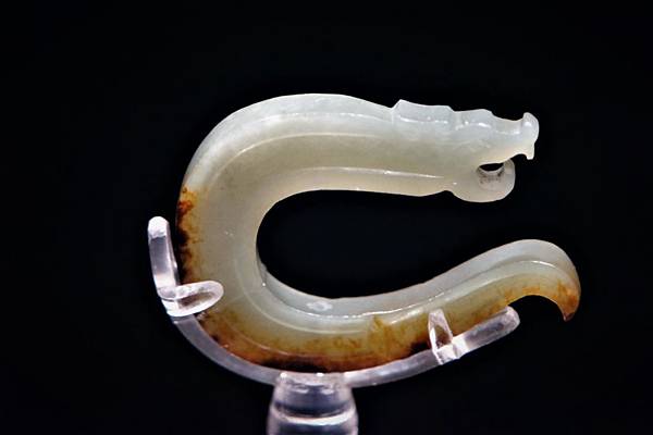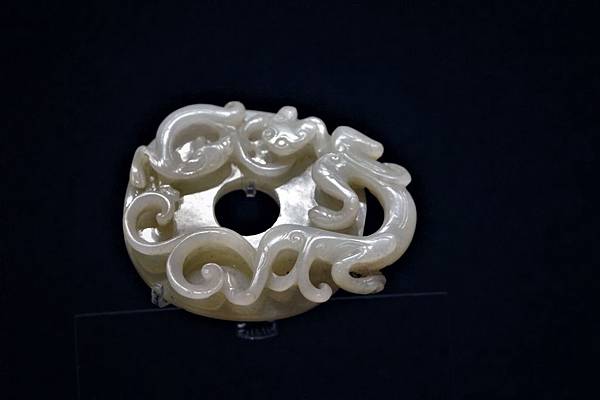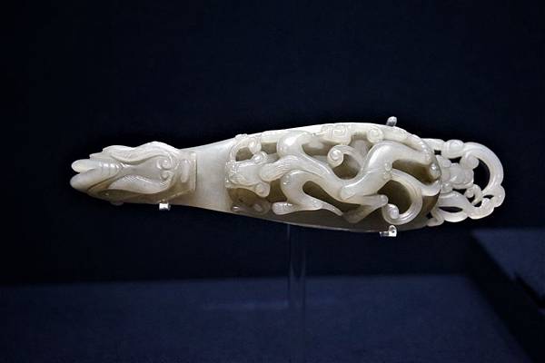 但先跟各位格友致歉,由於上博展覽的規範與規格和世界各大博物館一樣,為了保護文物不會變質,不能用太多角度的明亮照明來投射展品,所以照片的品質無法與圖錄的專業攝影相比。依照wake的身高,很難能以站立的姿勢拍清楚紋飾、雕工,若要清楚地照相照出紋飾雕工,wake必須蹲著馬步,降低上半身的高度,約要低到與展品高度平齊,才能就著展櫃的頂光反射,照清楚傾斜放置的玉器紋飾雕工。這就讓wake猶豫了,要想照清楚、需不斷地蹲馬步調焦距,還要閃開鏡頭前晃來晃去的其他遊客,往往一張照不清楚,還要在光線昏暗、不能用腳架的情況下連拍好幾張,勉強選其中最清楚的一張來用。有時斜著展示的玉器較長,焦距上面清楚了,下半段又模糊了,實在是懷疑要這麼幹嗎?想想來一次也不容易,品質欠佳也是分享,就開始蹲馬步練功吧!眾格友就將究的看了,到底這是wake花了三個多小時練功,好不容易選的一些還能看的玉器照片。由於一次文章能po的照片有限,將分三次文章來分享。
