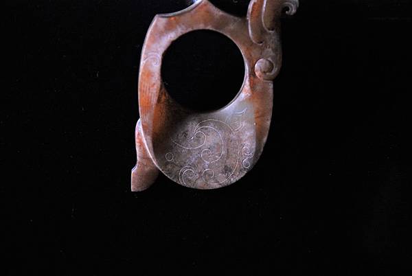 戰國青黃玉雲紋韘形珮。和闐青黃玉,受硃砂沁表面顯褐色或褐灰色,器表光澤。本件仍以射箭的拘弦器韘為原形,但厚度已壓縮為1公分,拘弦的短棒已變形為左側末端勾轉的雲氣紋,右側下方亦岐出一雲氣紋,似乎也是拘弦短棒的餘韻。弧凸面外側及孔洞邊緣均浮出一圈邊廓紋,中間雕琢錯落有致,略為方正的勾捲雲氣紋。背凹面有自孔洞向下延伸的凹槽,且用游絲描線切琢出極細的雲氣紋。