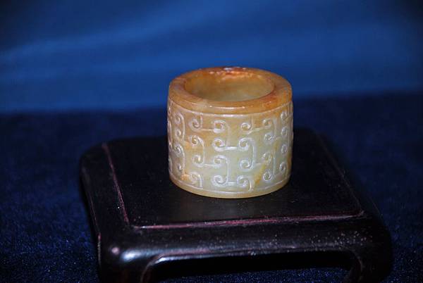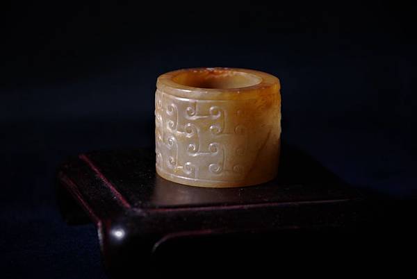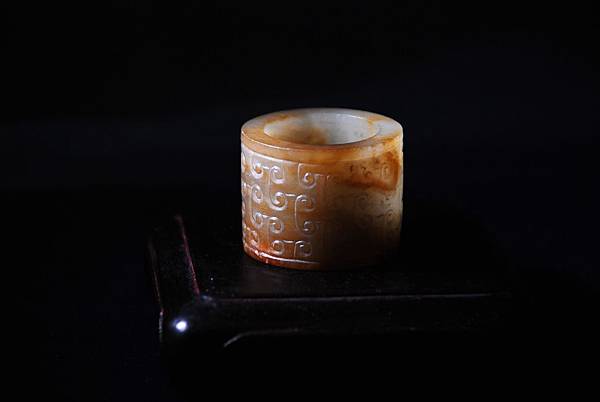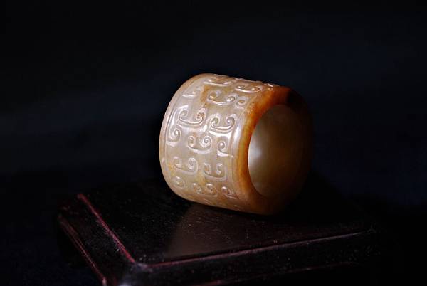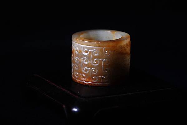 戰漢青玉勾連紋扳指。和闐青黃玉,受鐵沁擾,部分玉理呈現紅黃色。本件為一筒狀玉器,外壁上下緣切琢一道弦紋陰線,兩道弦紋間的外壁面則用粗陰線滿琢勾連的雲氣紋(或稱丁勾紋)。雲氣紋的大小不一,中間聯繫各雲紋的短橫陰線為最後切琢上去的工序,似乎有些勉強?wake認為本件為漢代的扳指。