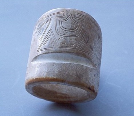 戰漢時期的韘形珮、雞心珮蔚為風尚,有非常多的韘形珮出土,但射箭用的韘呢?這種射箭的拘弦器,突然少見出土了。戰漢的貴族、武士不射箭了?那當然不可能。Wake認為,隨著弓箭改良、射箭姿勢的調整,筒形的韘又成為武士的射箭主流工具了。