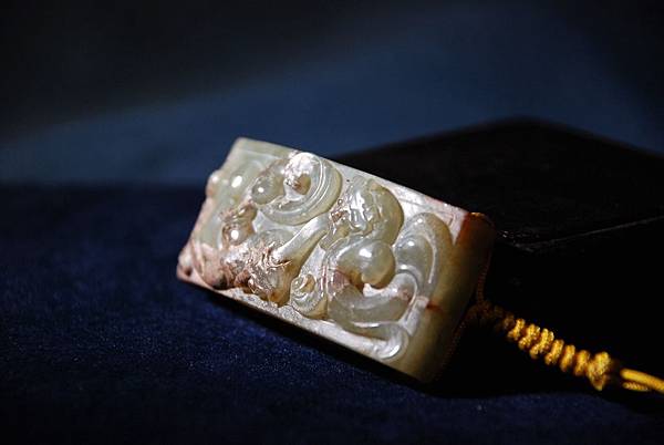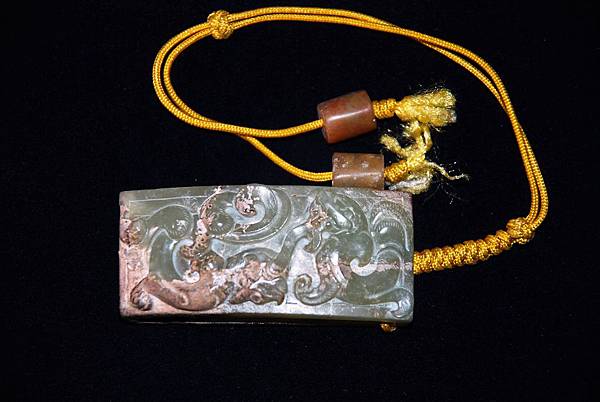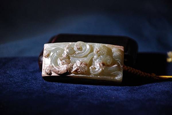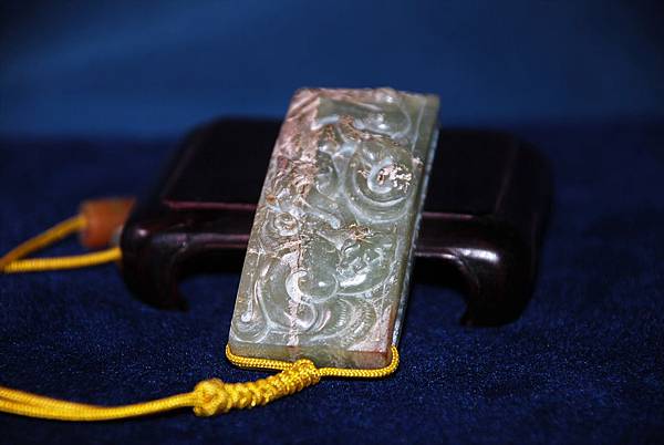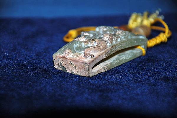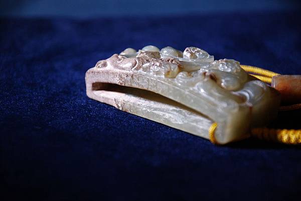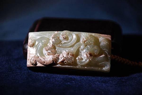 西漢青玉龍鳳紋劍衛。和闐青玉,少部分玉質呈灰色質變。本件劍衛(wake的電腦找不到劍衛這衛字的正確字體,請格友將就著看囉)正面成橋拱狀,其上雕琢螭虎、螭鳳各一,身軀穿雲扭轉、四肢攀蹬有力,穿梭在雲端。背面無紋飾。本件為西漢前中期的玉劍飾。